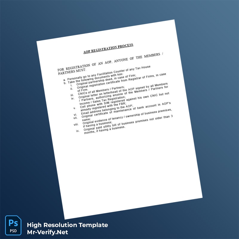 The Pakistan Tax Authority AOP Registration Certificate Word and PDF Template is designed for professionals seeking a quick, reliable, and fully customizable certificate solution. This editable registration certificate template allows you to efficiently update all necessary details to meet official requirements, eliminating the hassle of starting from scratch or waiting for delays in obtaining critical business documents.