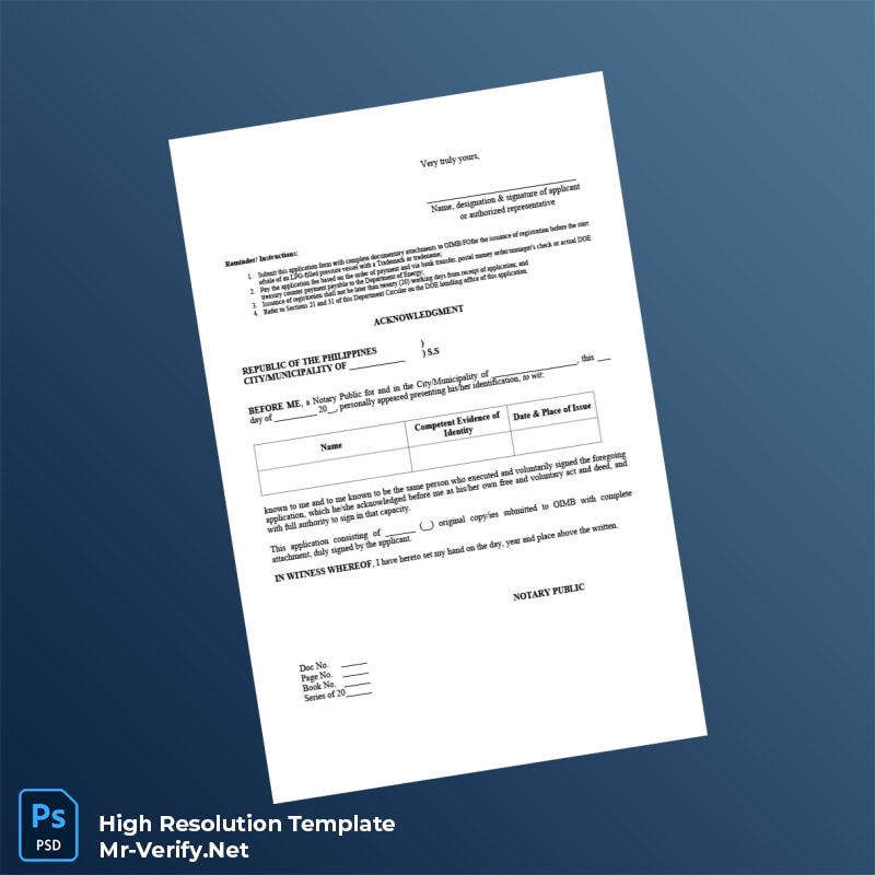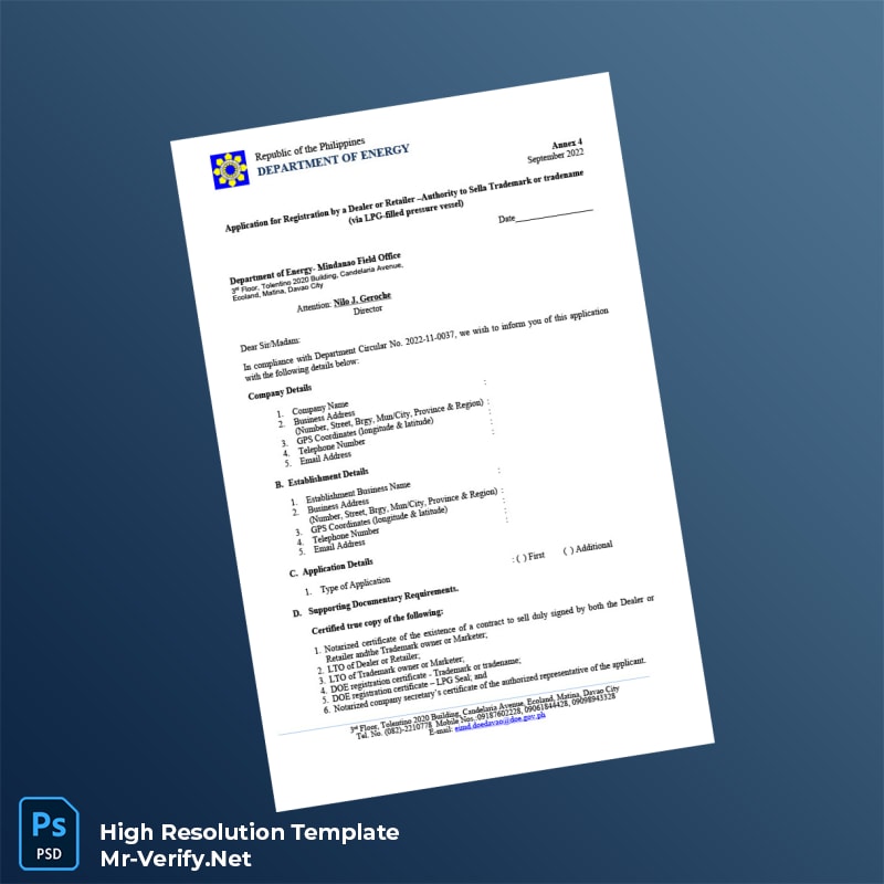 Don’t let expired or missing certificates delay your business progress. Order the Philippines Department of Energy Registration Certificate Word and PDF Template now and experience a hassle-free way to produce a professional and compliant registration document. Elevate your business’s operational integrity today!