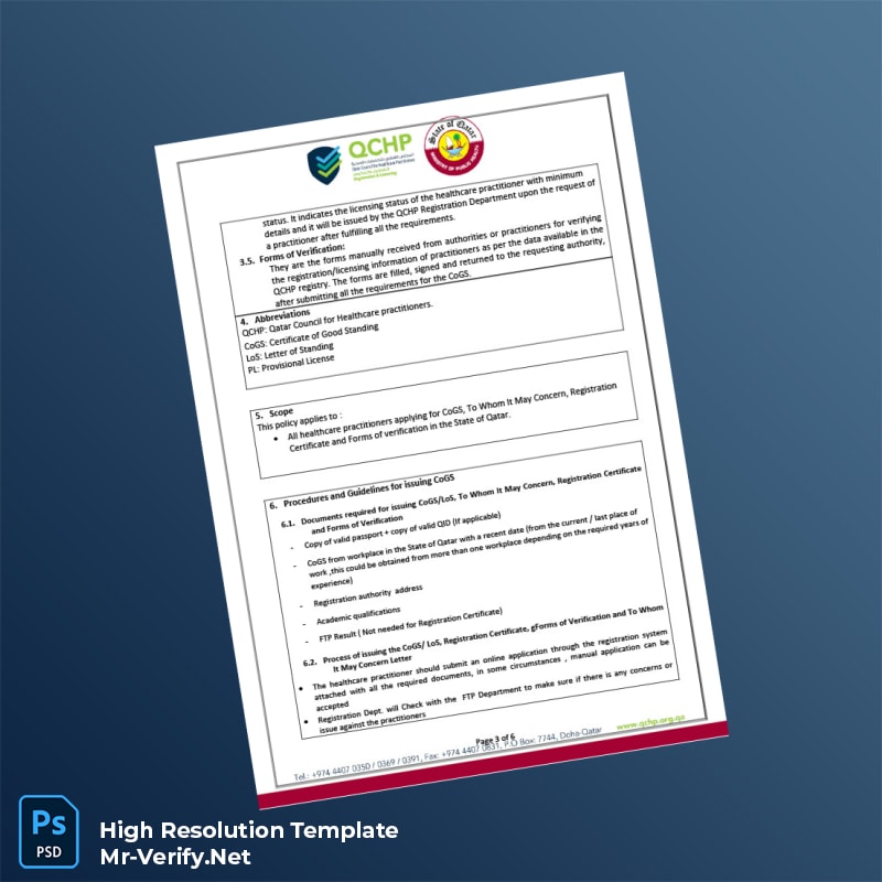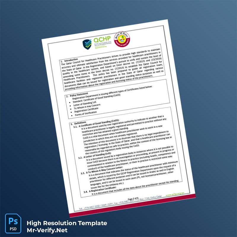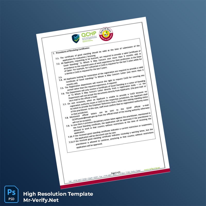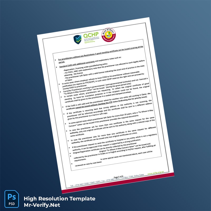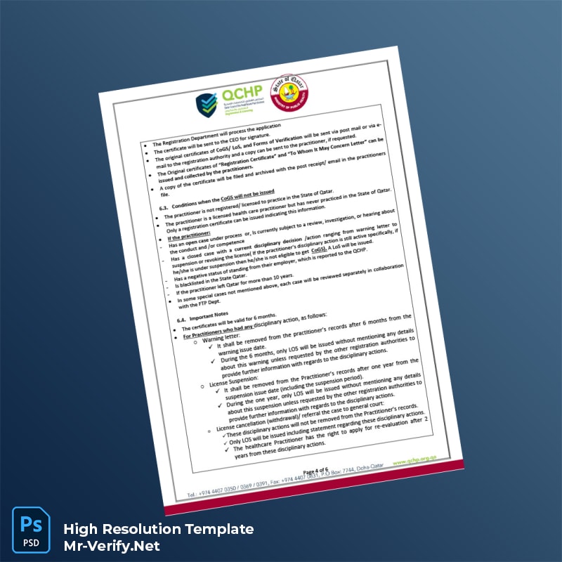 Editable Qatar Qatar Council for Healthcare Practitioners Certificate of Good Standing Word and Pdf Template 6 page