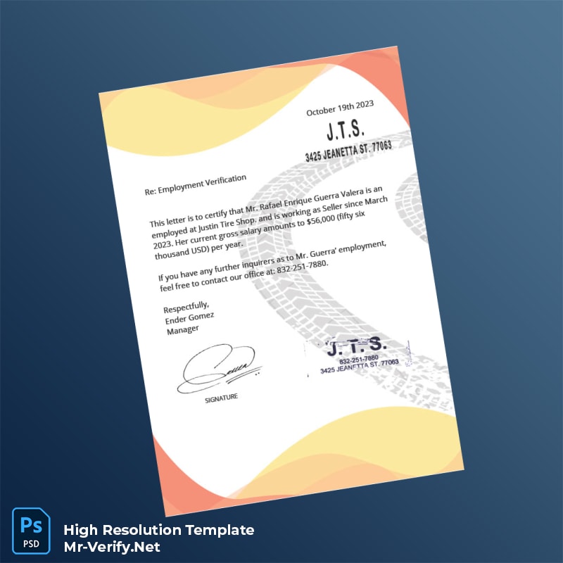Ensure accurate and professional confirmation of employment with the United States Justin Tire Shop Employment Verification Letter Word and PDF Template. Designed for busy HR professionals and administrative staff, this editable document template offers a seamless solution to promptly validate job details while maintaining a polished corporate image.