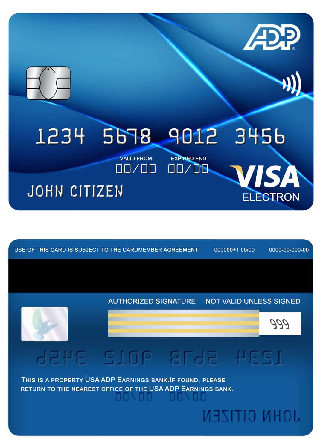 Do you want to use a fillable visa electron card that truly reflects your authority and is realistic? Look no further! Our customizable USA ADP Earnings bank visa electron card templates in PSD format are the perfect solution.