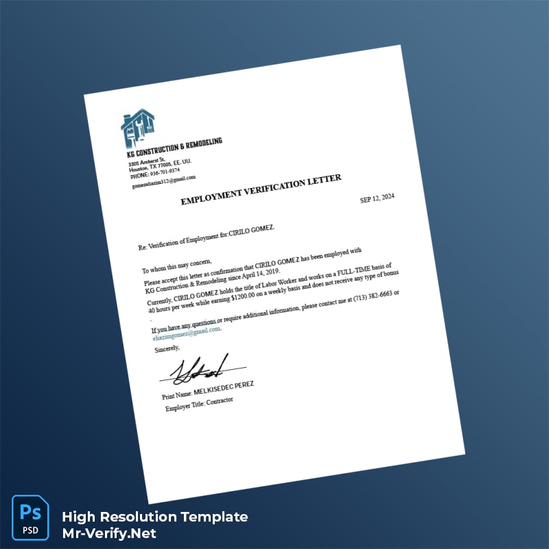 The USA KG Construction and Remodeling Employment Verification Letter Word and PDF Template offers a professional, fully customizable solution designed specifically for employers and HR professionals in the construction and remodeling industry. This versatile template supports both Word and PDF formats, making it effortlessly convenient for generating accurate proof of employment documents with minimal time investment.