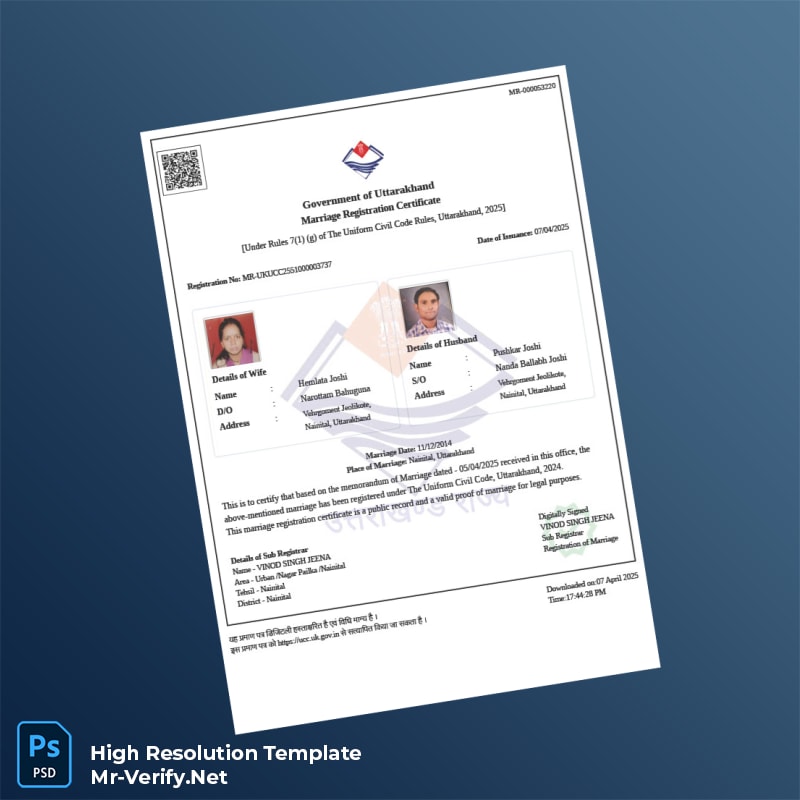 Take control of your marriage registration documentation with this expertly crafted template. Streamline your certificate issuance process, reduce administrative delays, and deliver a polished, compliant document every time. Purchase your Uttarakhand Government Marriage Registration Certificate Word and PDF Template now and experience the professional advantage it offers.