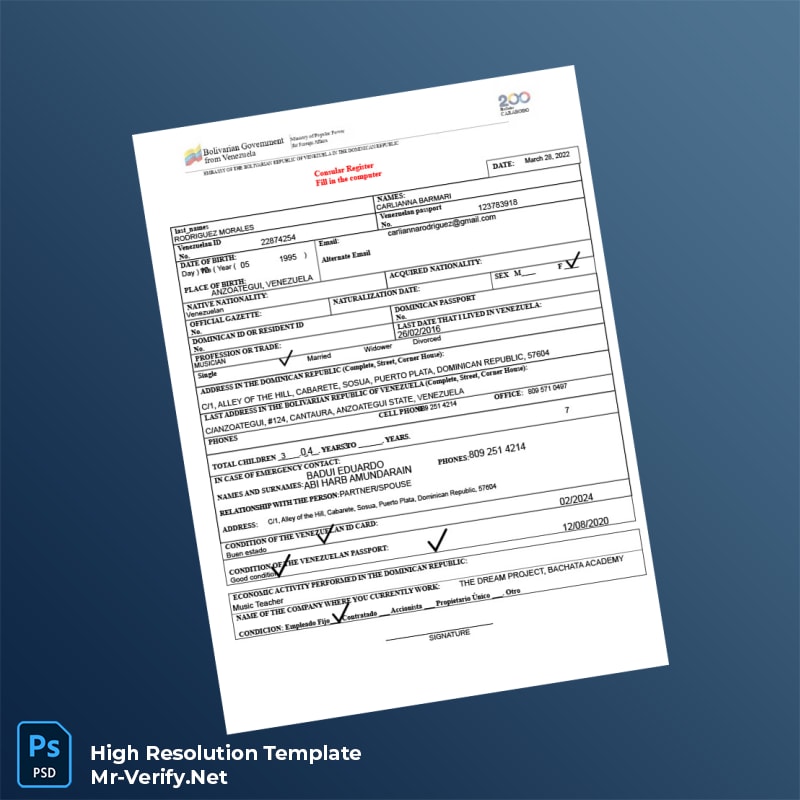 This registration certificate template includes all necessary fonts and is formatted for high-resolution printing, ensuring your final document looks official and meets embassy standards. Easily edit all fields such as full names, dates, and registration numbers to maintain accuracy. The instant file download feature after payment means you can access your template right away, starting your documentation process promptly.
