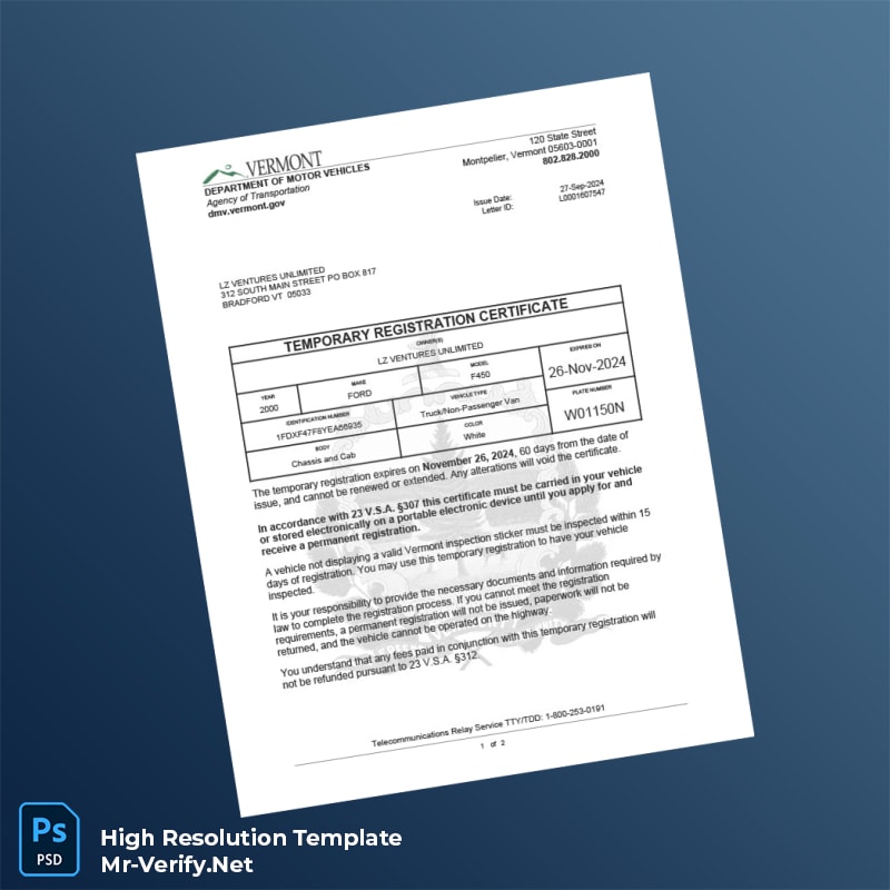 Editable Vermont Department of Motor Vehicles Temporary Registration Certificate Word and Pdf Template 2 page