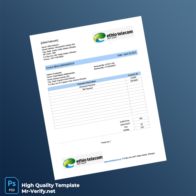 Take the first step towards hassle-free documentation today. Don’t let lost or faded utility bills hinder your professional journey. Download the Ethiopia Ethio Telecom Editable Utility Bill Template now and enjoy peace of mind with reliable, editable documents. For additional related templates, browse through our extensive catalog, including options such as Estonia utility bill template, that can further assist you with your documentation needs. And for more design options, check out various editable PSD templates here.