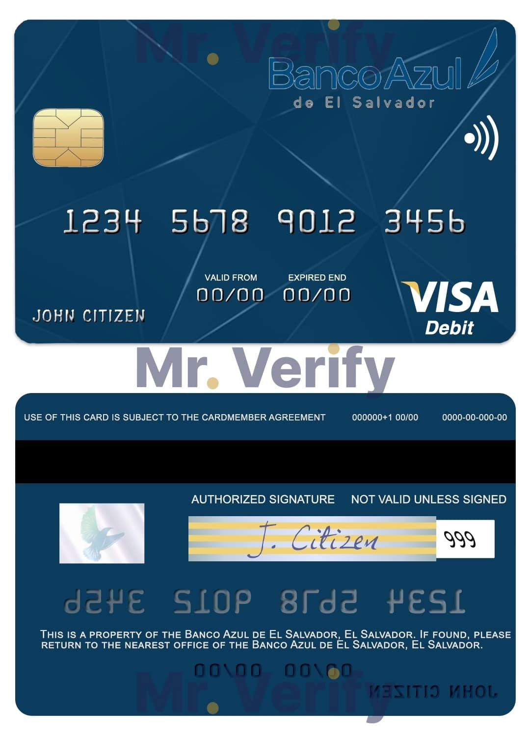 Our Fillable El Salvador Banco Azul de El Salvador visa debit card Templates PSD templates are user-friendly and come with well-organized layers, making customization a hassle-free process for both designers and non-designers. With our templates, you can create custom visa debit cards that suit your needs and preferences, without the need for advanced design skills or software.