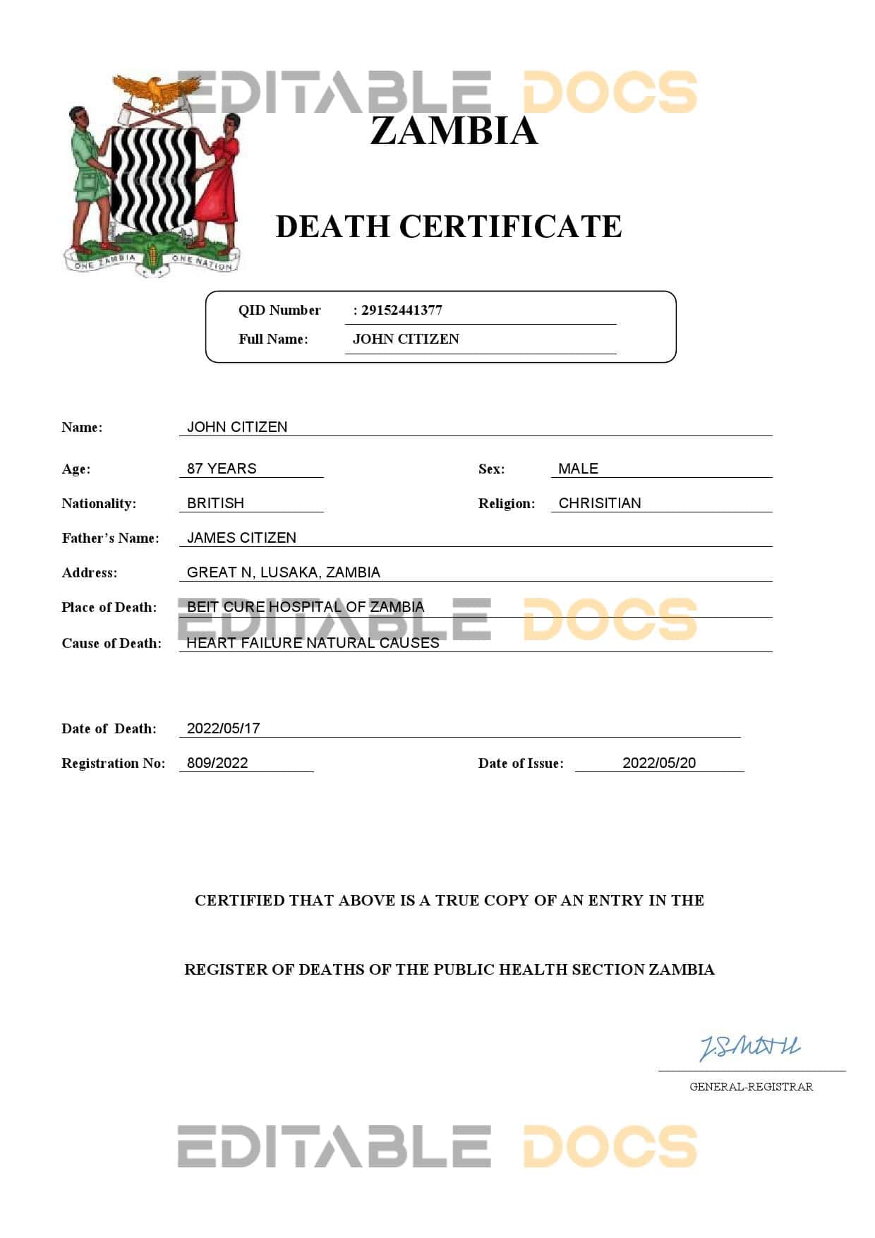 Welcome to EditableDocs.cc, your go-to destination for customizable death certificate templates in Microsoft Office Word (.docs) format. Our wide selection of death certificate templates from countries around the world allows you to effortlessly create authentic-looking documents. Whether you need death certificates for entertainment purposes, movie production, or educational projects, our templates are designed to add realism and convenience to your creative endeavors.
