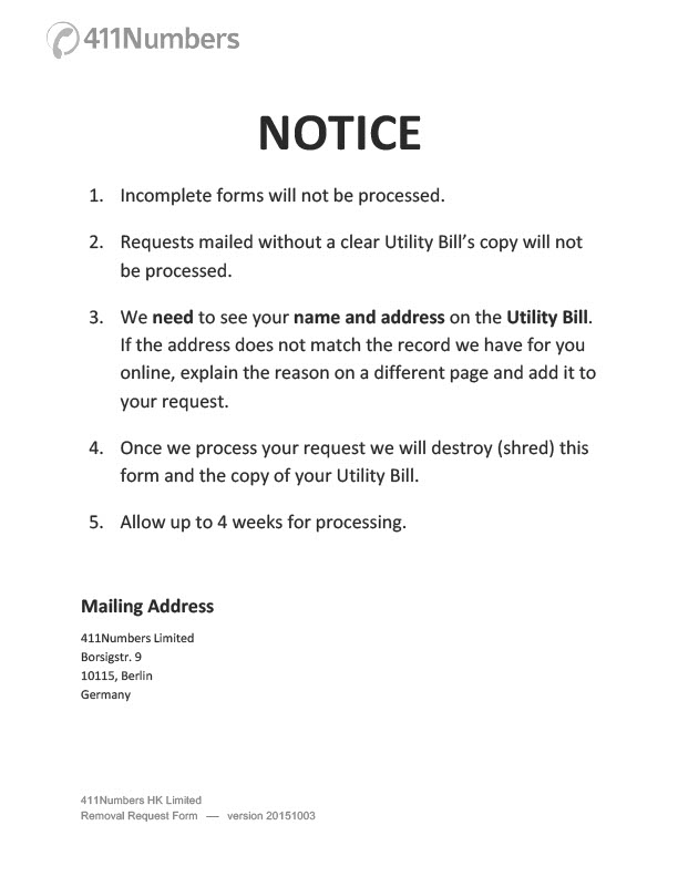 Germany 411Numbers Limited Editable Removal Request Form Template