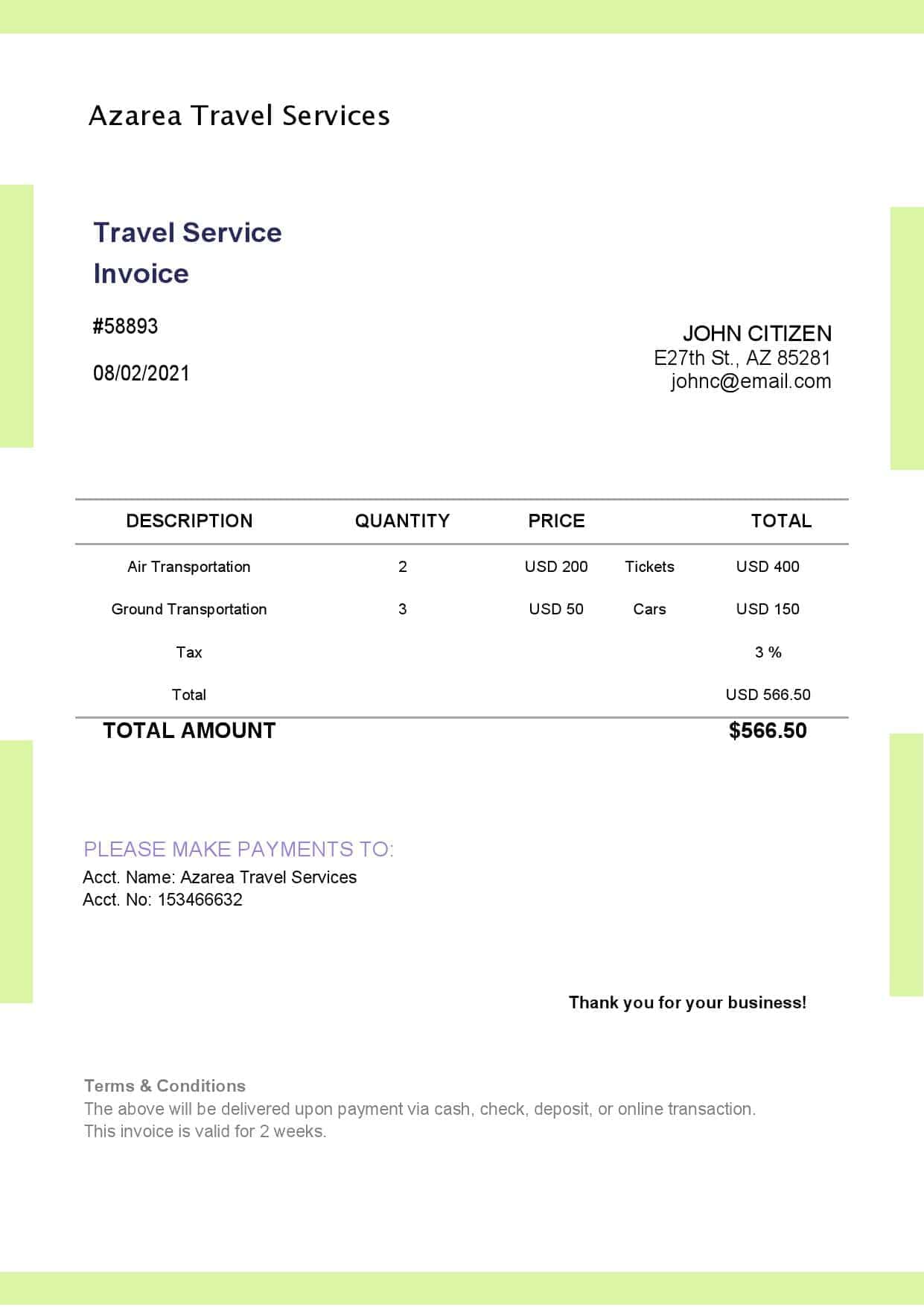 USA Azarea Travel Services Invoice Template for Efficient and Professional Business Operations