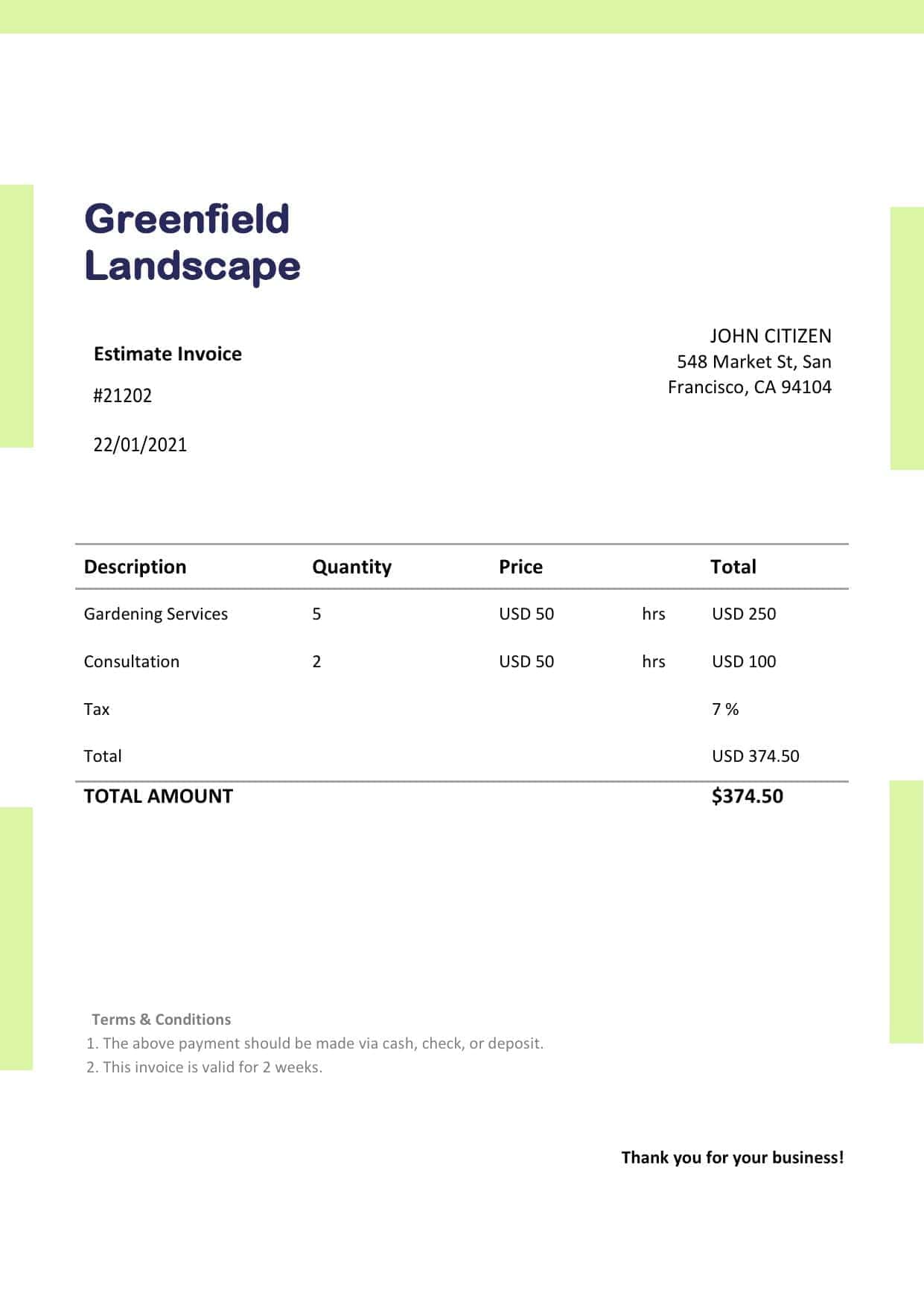 USA Greenfield Landscap Invoice Template for Efficient and Professional Business Operations