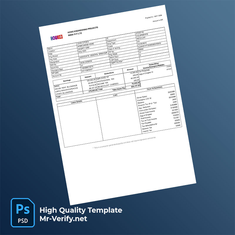 Howe Engineering Projects India PVT LTD payslip word and pdf template