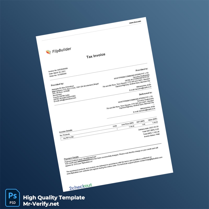 India Avangate BV dba 2Checkout Tax Invoice Template in Word and PDF
