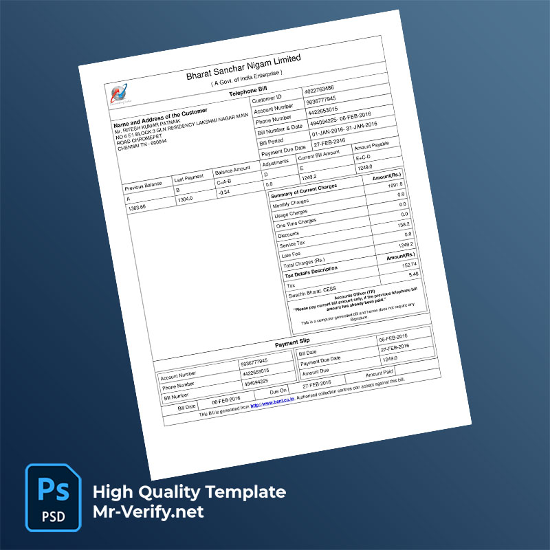 India Bharat Sanchar Nigam Limited Editable Telephone Bill Template in Word and PDF formats