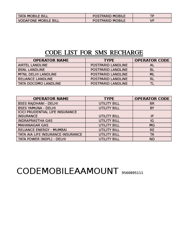 India Editable SMS Recharge Operator Codes List Template in Word and PDF formats 2 page