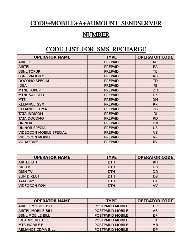 India Editable SMS Recharge Operator Codes List Template