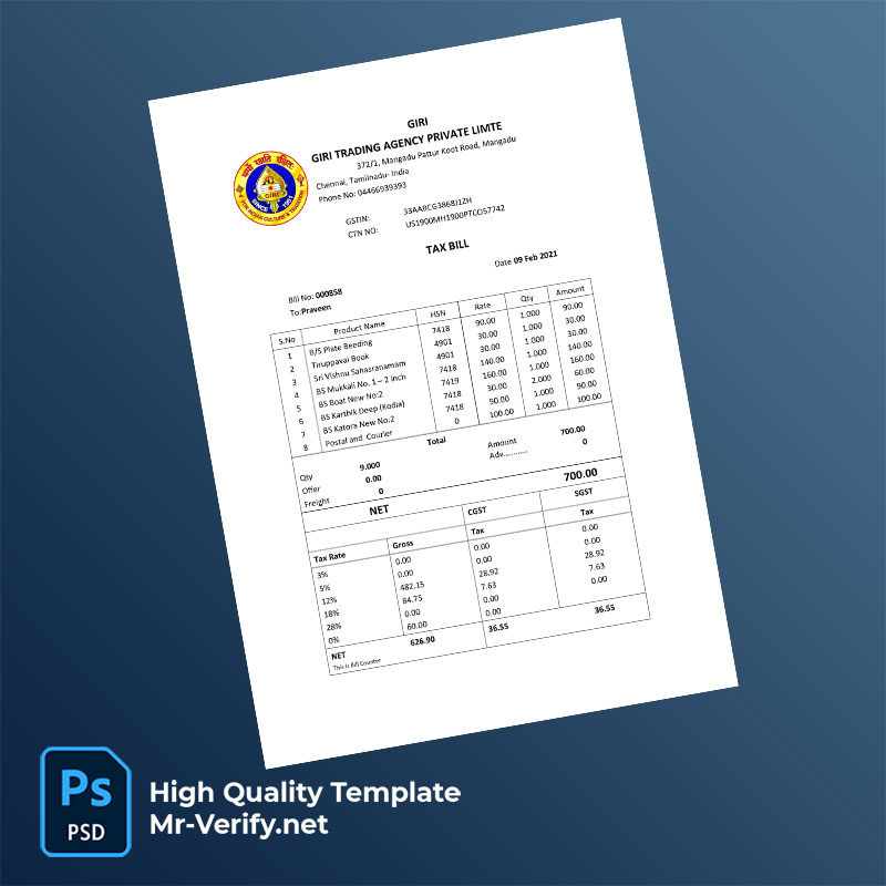 India Giri Trading Agency Private Limited Editable Tax Bill Template in Word and PDF formats