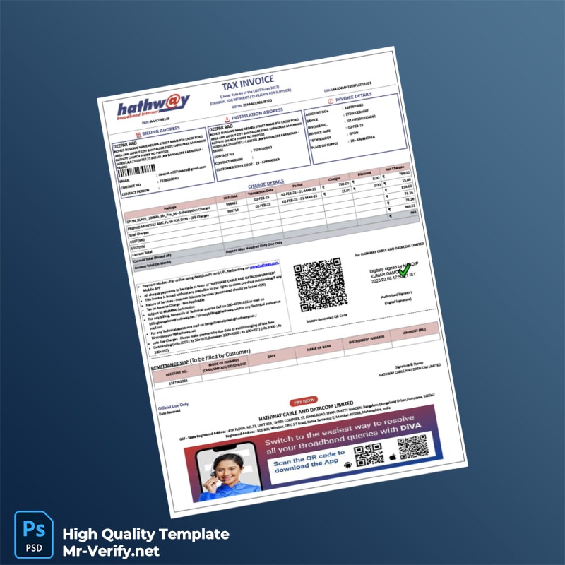 India Hathway Cable and Datacom Limited Tax Invoice Template – Editable Word and PDF Formats