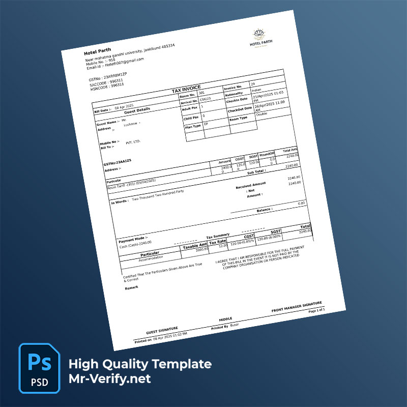 India Hotel Parth Editable Hotel Bill Template in Word and PDF formats