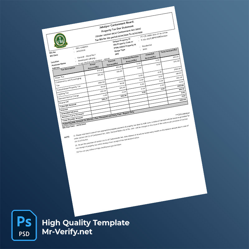India Jabalpur Cantonment Board Editable Property Tax Due Statement Template in Word and PDF formats