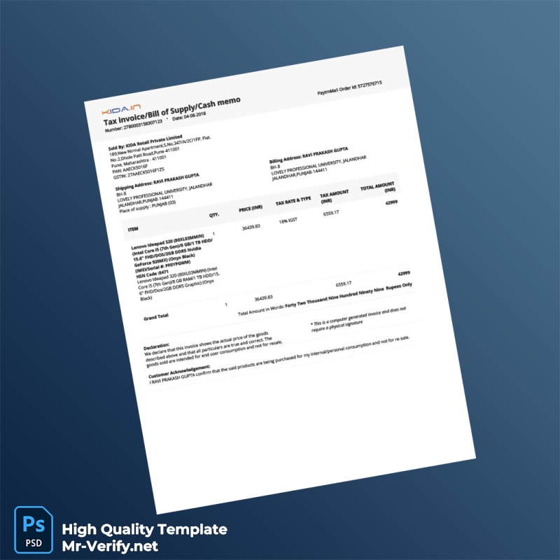 India KIDA Retail Private Limited Tax Invoice Template in Word and PDF formats