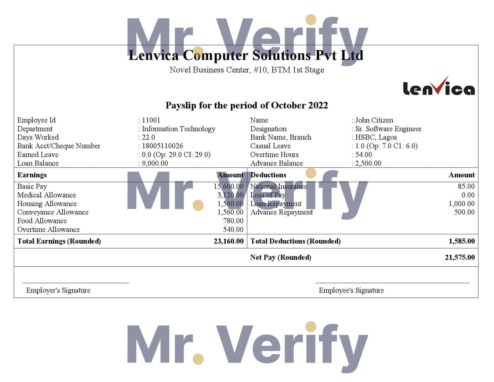 India Lenvica computer solutions company Word Fillable Pay Stub Proof :