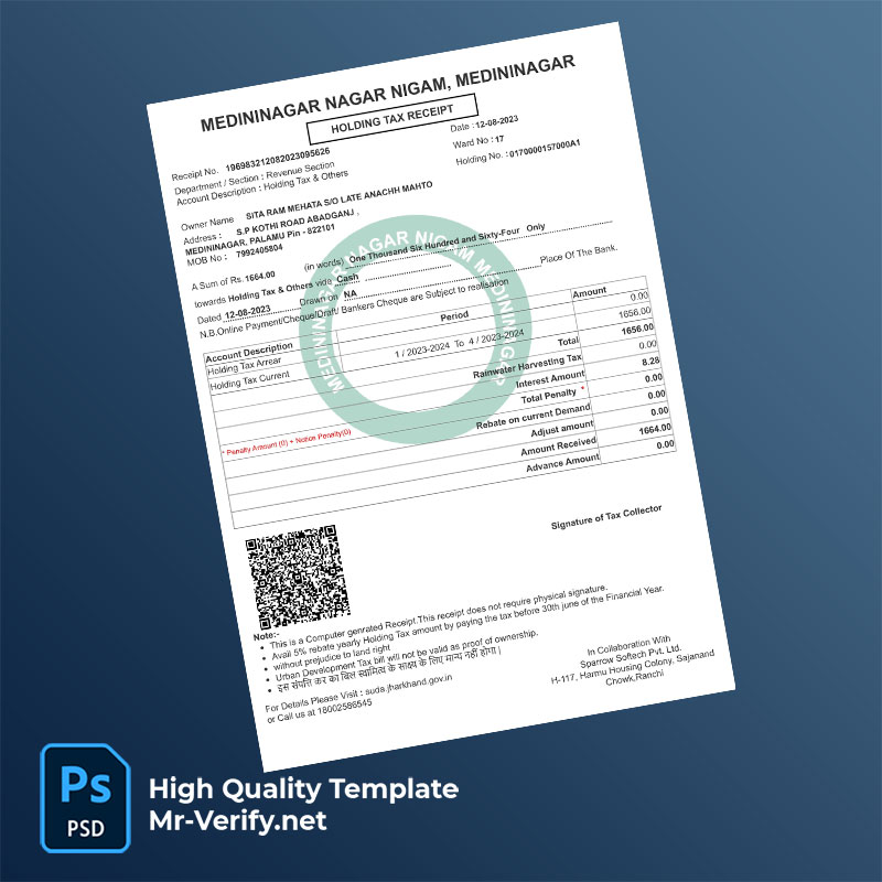 India Medininagar Nagar Nigam Editable Holding Tax Receipt Template in Word and PDF formats