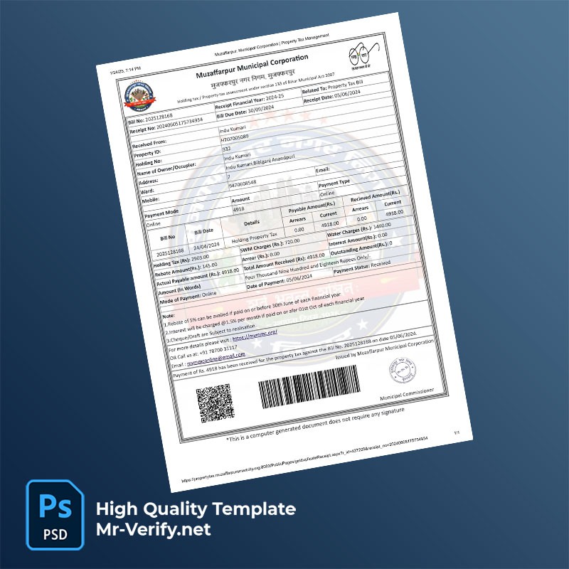 India Muzaffarpur Municipal Corporation Editable Property Tax Receipt Template in Word and PDF formats