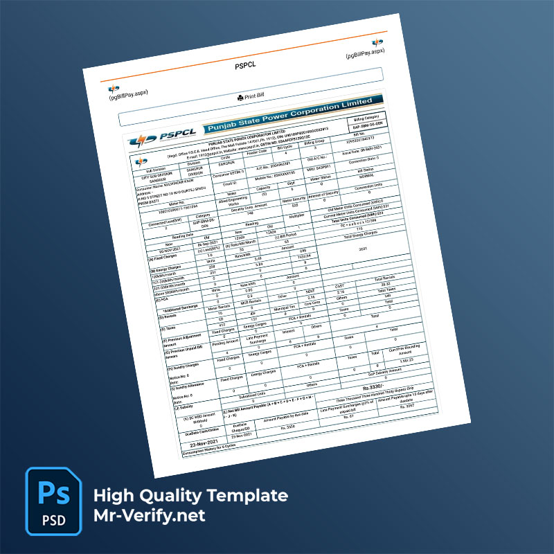 India Punjab State Power Corporation Limited Editable Electricity Bill Template in Word and PDF formats