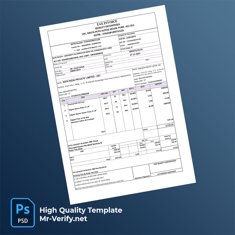 India Quality Enterprises Editable Tax Invoice Template in Word and PDF formats