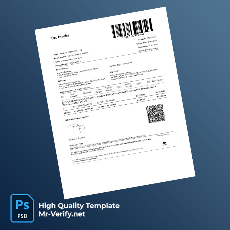India Shiva International Apparels Editable Tax Invoice Template in Word and PDF formats