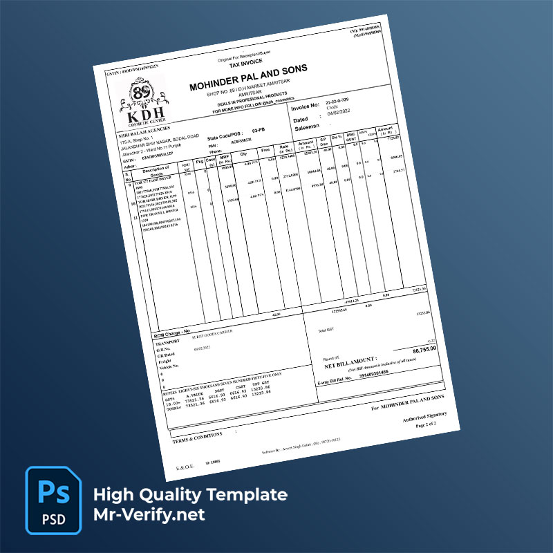 India Smriti Indane Tax Invoice Template in Word and PDF formats 2 page