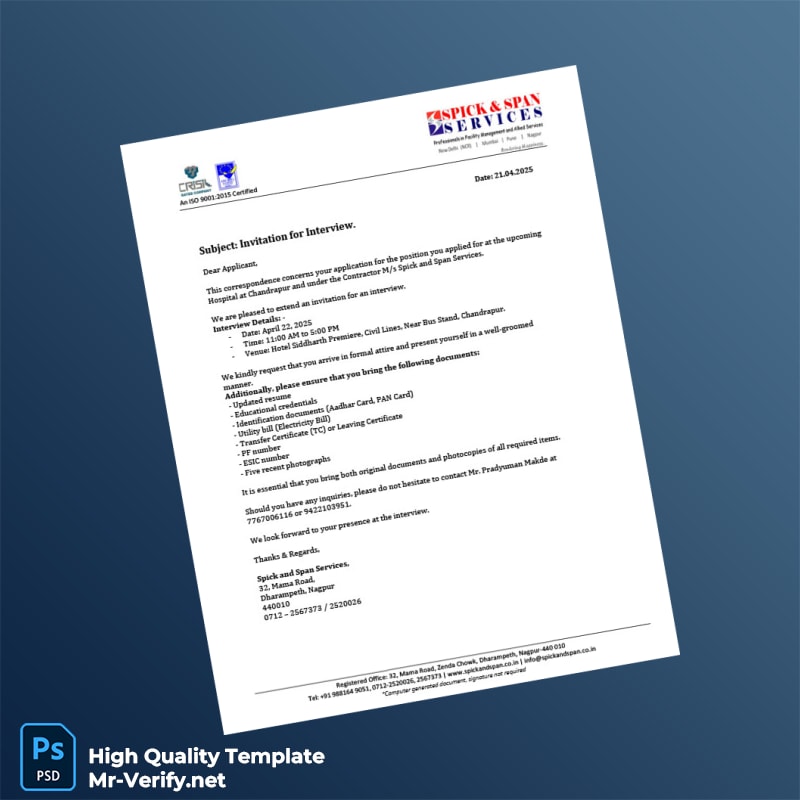 Introducing the India Spick and Span Services Editable Interview Call Letter Template, the ultimate solution for professionals who need reliable documentation assistance. Whether you’re facing urgent deadlines or simply looking for a quick way to generate essential documents, our template provides the perfect platform to ensure your professional communications are impeccable.