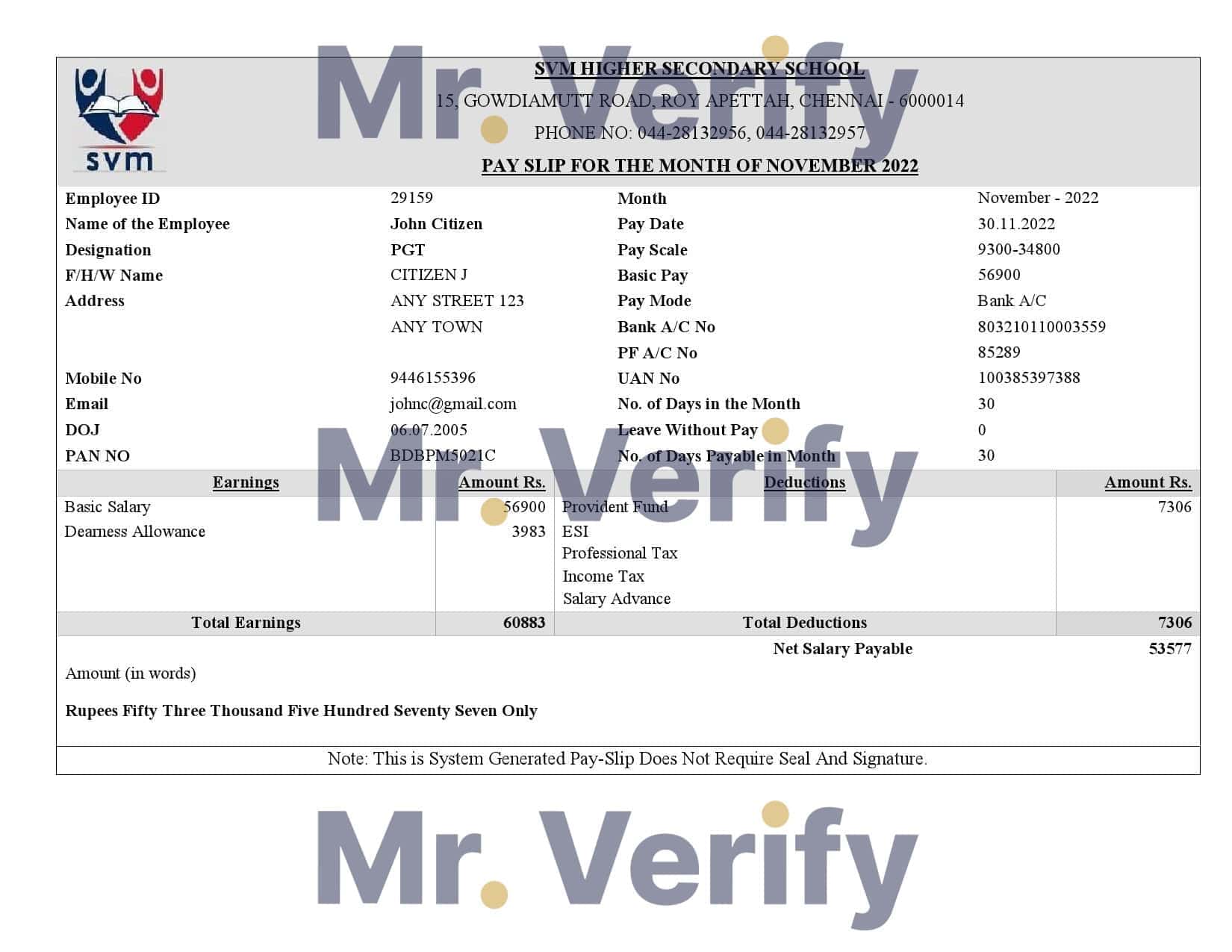 India SVM HIGHER SECONDARY SCHOOL educational company Editable Pay Stub PDF Template :