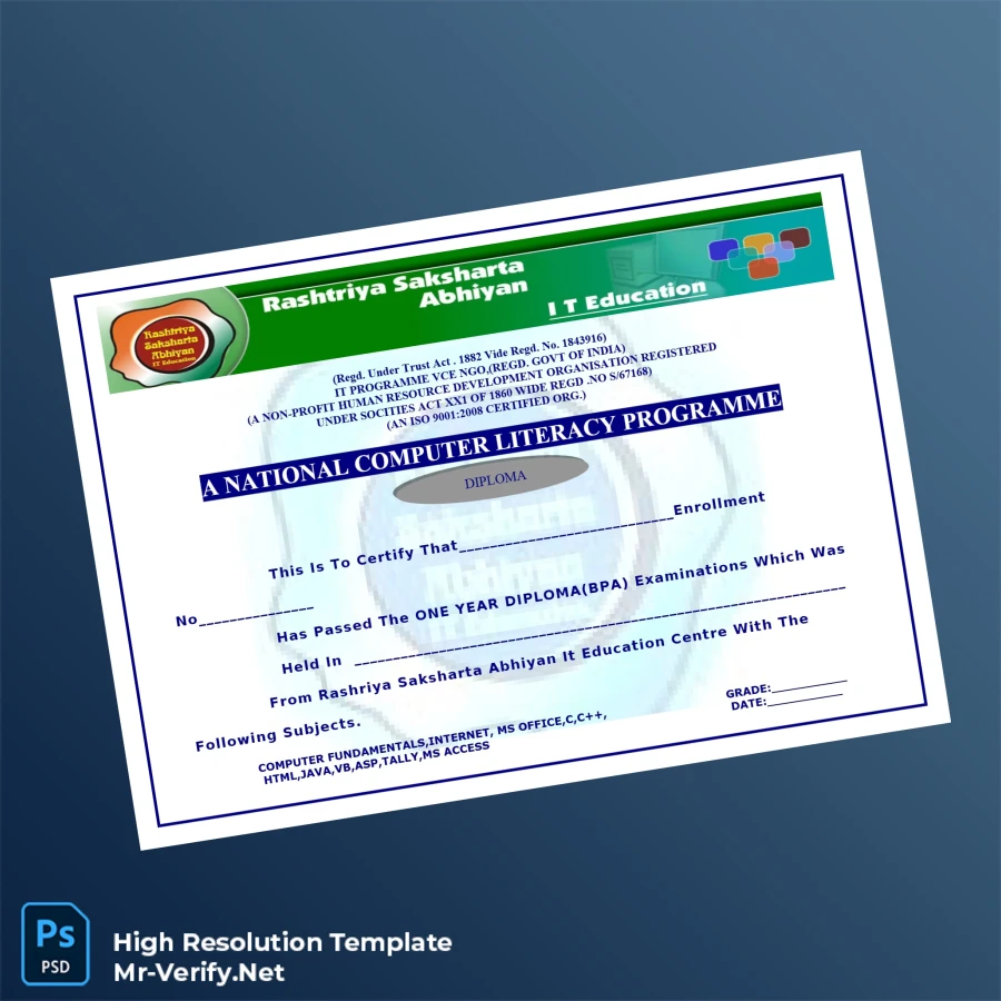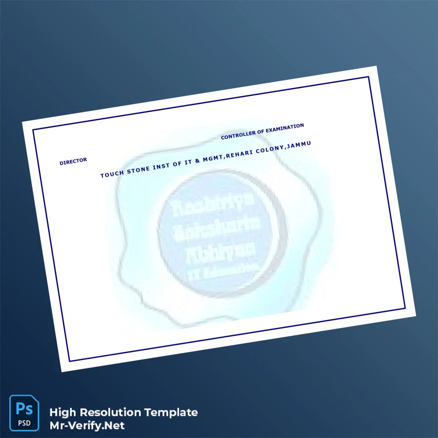 This high-resolution, fully customizable diploma template offers a professional-grade solution for creating or replacing your National Computer Literacy Diploma from the prestigious India Touch Stone Institute of IT & Management. Designed for seamless editing, this template is compatible with widely used software and includes organized layers for effortless personalization of recipient names, dates, and other essential details.