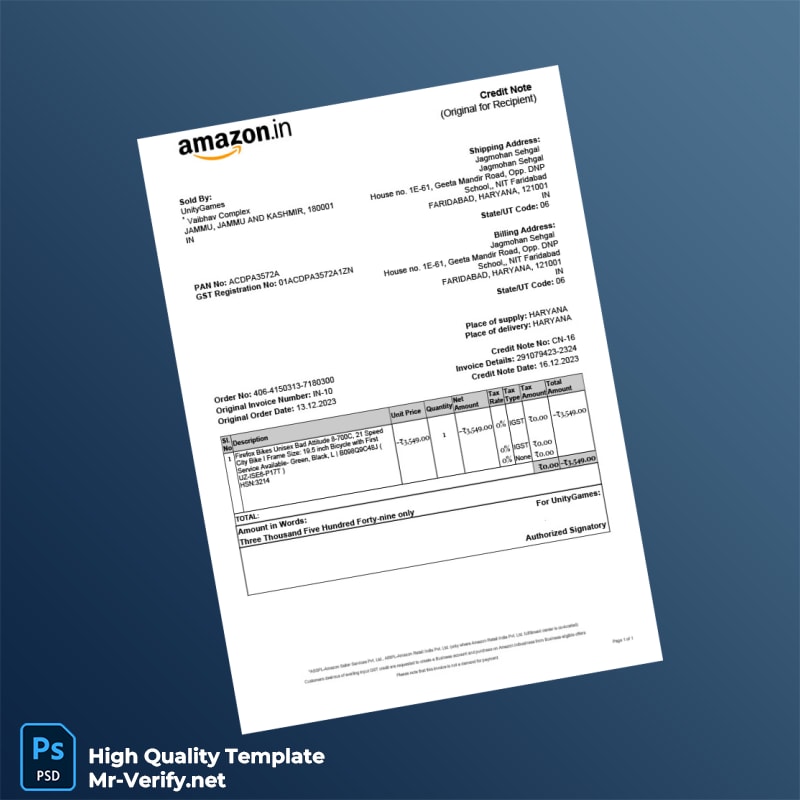India UnityGames Credit Note Template: Professional Editable Invoice Solution in Word and PDF