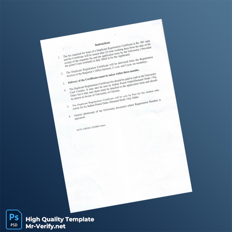 India University of Calcutta Editable Duplicate Registration Certificate Template Overview
