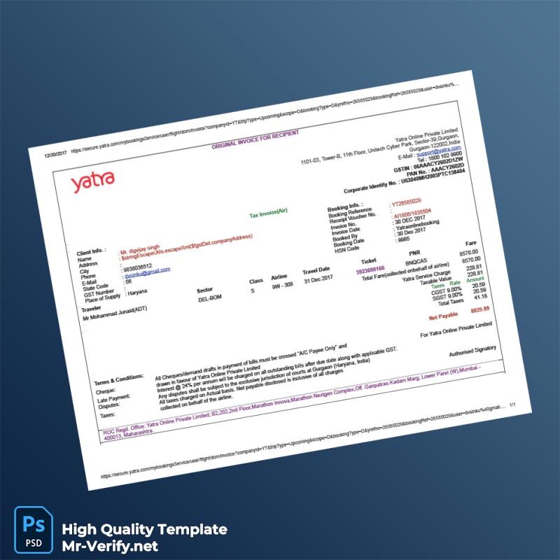 India Yatra Online Private Limited Tax Invoice Template – Editable Word and PDF Formats