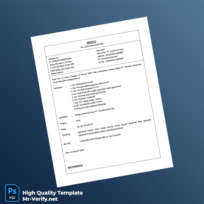 Stop struggling with outdated or non-editable invoice documents. The Indonesia PT Persada Konstruksi Invoice Template lets you edit, print, and send invoices quickly and professionally. Purchase now to enjoy instant access and create flawless invoices that support your business success.