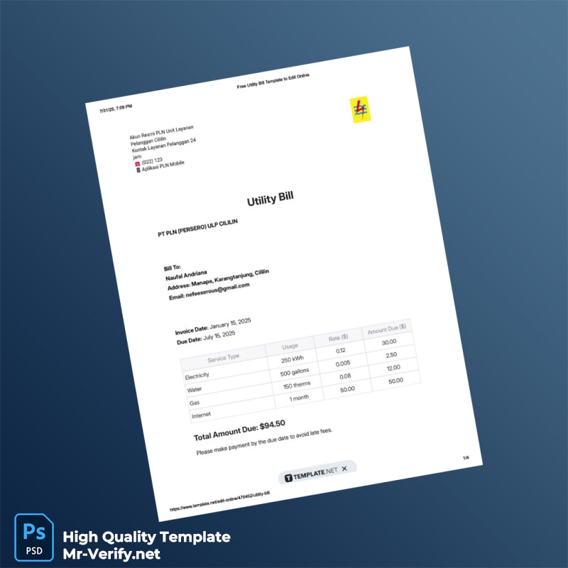 If you ever found yourself in a situation where you urgently needed proof of address—maybe your original document was lost or stolen—you know how challenging and stressful it can be. Introducing the Indonesia PT PLN Persero Editable Electricity Bill Template, designed specifically for professionals who require a fast and reliable solution to create authentic-looking utility bills.
