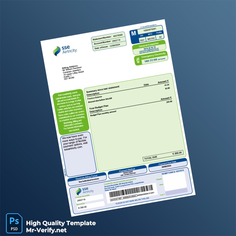 Ireland SSE Airtricity Editable Electricity Bill Template