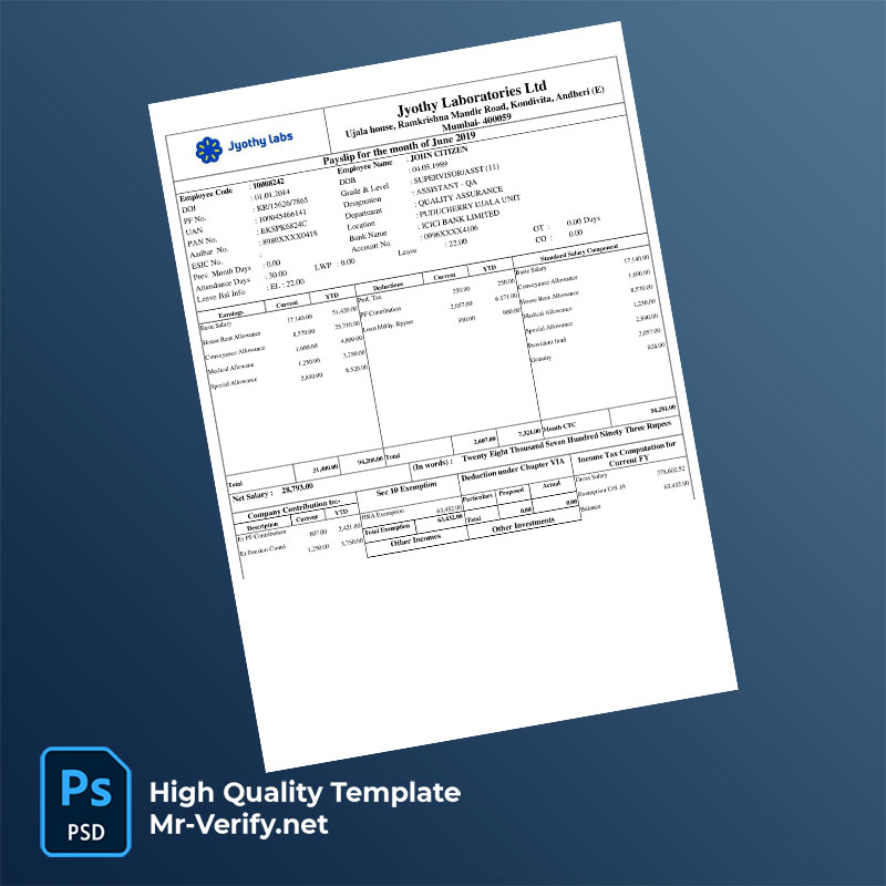 Jyothy Laboratories Ltd payslip word and pdf template