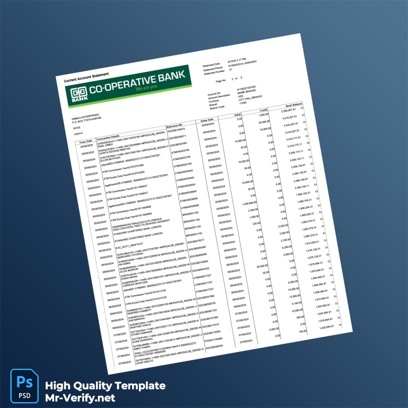 Kenya Cooperative Bank Account Statement Template in Word and PDF formats 6 page