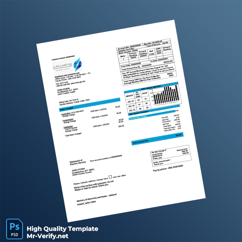 Kuwait Ministry of Electricity and Water Editable Electricity Bill Template