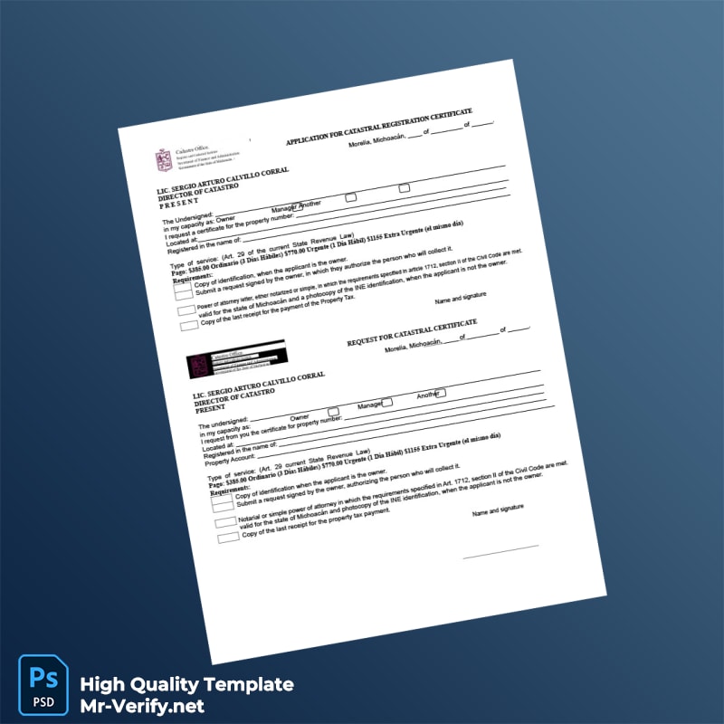 Mexico Cadastral Office Request for Cadastral Registration Certificate Template