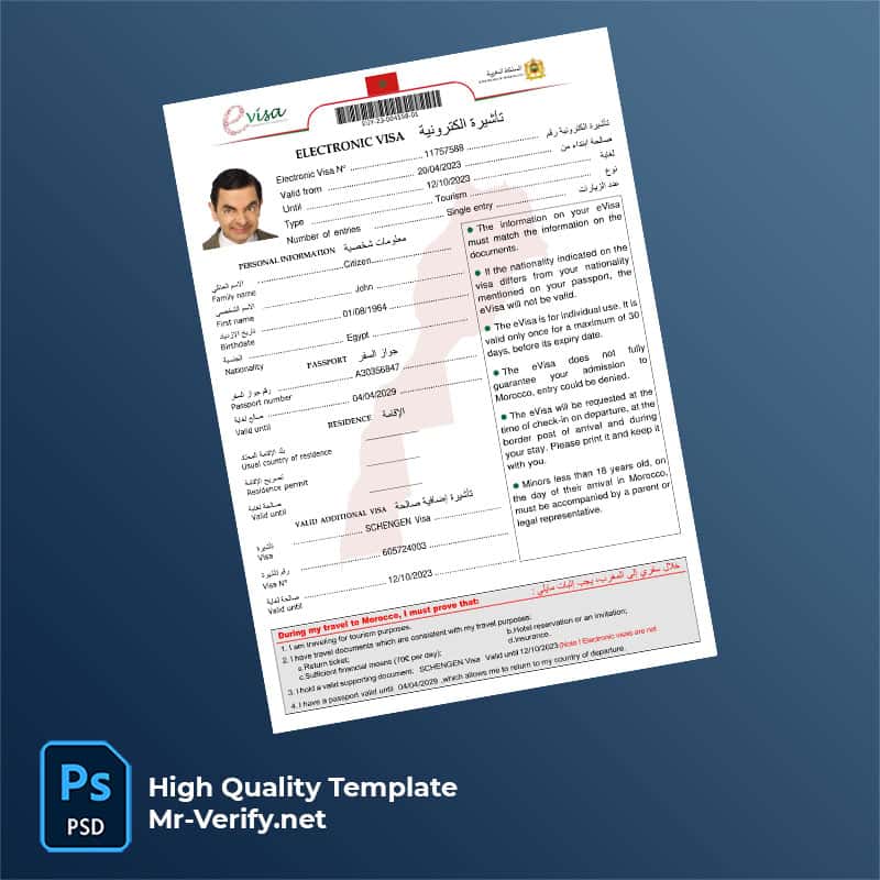This editable Morocco eVisa Word and PDF template is crafted for accuracy and realism, making it a valuable asset for those involved in identity verification processes, document customization, and digital illustration projects.