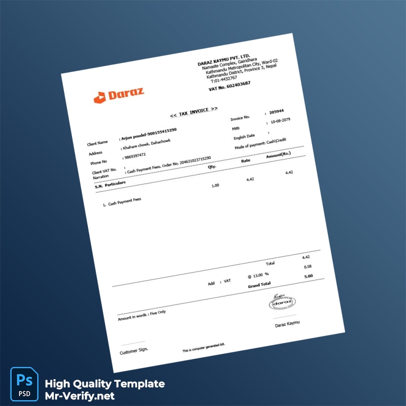 Nepal Daraz Kaymu Pvt Ltd Editable Utility Bill Template