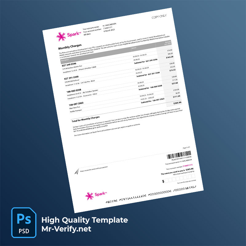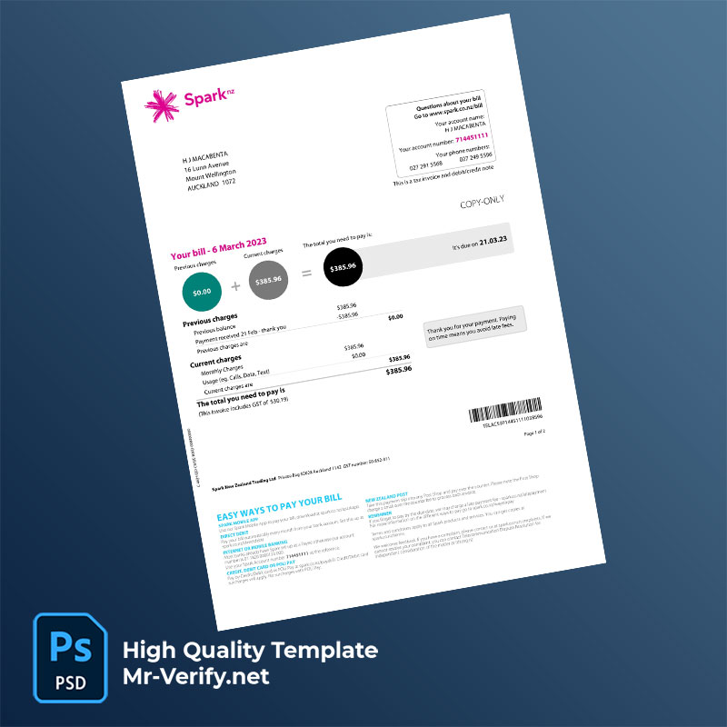 New Zealand Auckland Spark New Zealand Trading Ltd Editable Mobile and Broadband Bill Template in Word and PDF formats