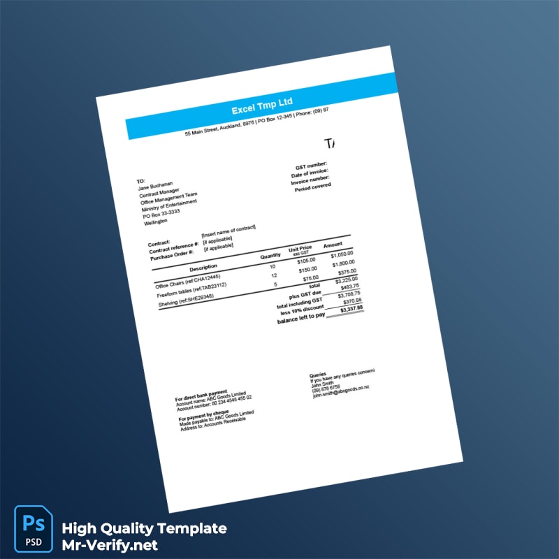 The New Zealand Excel Tmp Ltd Invoice Template offers a seamless solution for professionals needing a reliable, editable invoice format available in both Word and PDF. Designed specifically for businesses requiring an efficient and customizable invoice system, this template ensures clarity, professionalism, and ease of use in every billing interaction.
