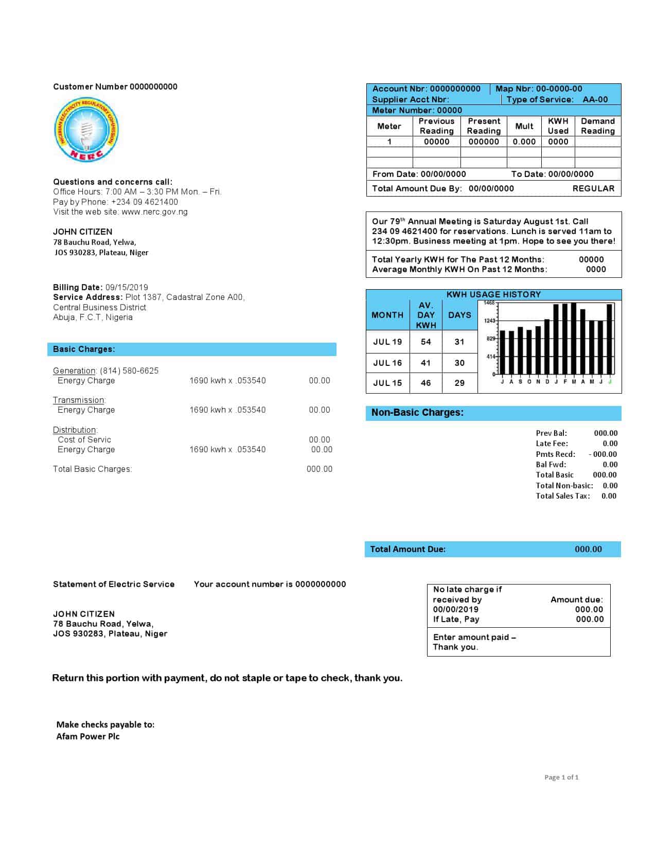 Nigeria Electricity Bill Template – Nigerian Electricity Regulatory Commission (NERC) – Editable Utility Bill in Word and PDF